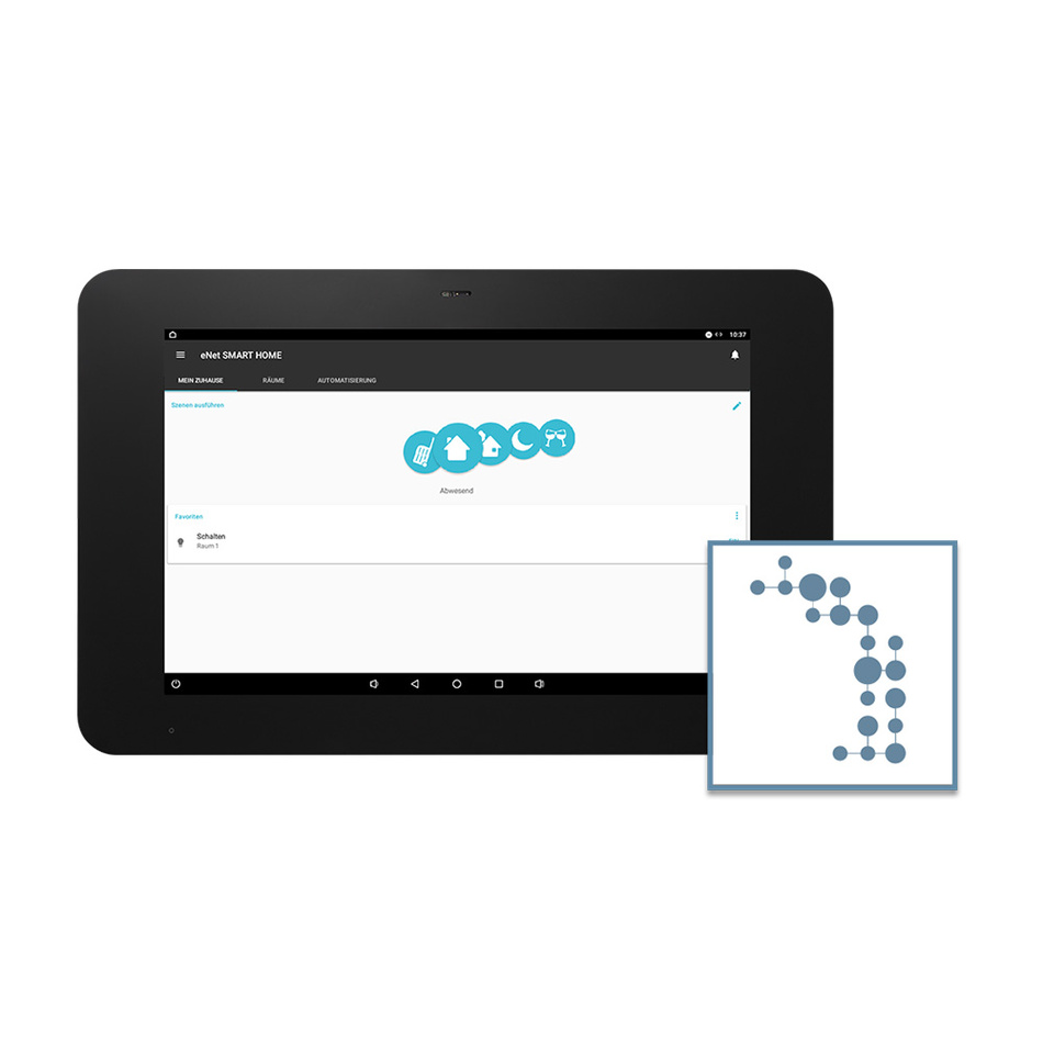 Komfort, Funktionalität und Sicherheit: Das JUNG Smart Control 8 ist ein kapazitives Touch-display für die Steuerung sämtlicher Funktionen von der Türkommunikation bis zur Bedienung des Smart Homes. Im Zusammenspiel mit einem eNet oder KNX Server ermöglicht es die Steuerung der Gebäudefunktionen. Das Display mit einem Durchmesser von acht Zoll (20,32 cm) hat einen hochauflösenden HD-Screen. Dank der individuell anpassbaren Helligkeit der Anzeige stellt es das Bild auch bei variierenden Lichtverhältnissen klar und deutlich dar. Farbbrillanz, Schärfe und modernste Displaytechnik vereinfachen die komfortable Bedienung wie bei neuesten Tablets. Der hohe Detailgrad verschafft einen klaren Überblick über die zahlreichen Funktionen.