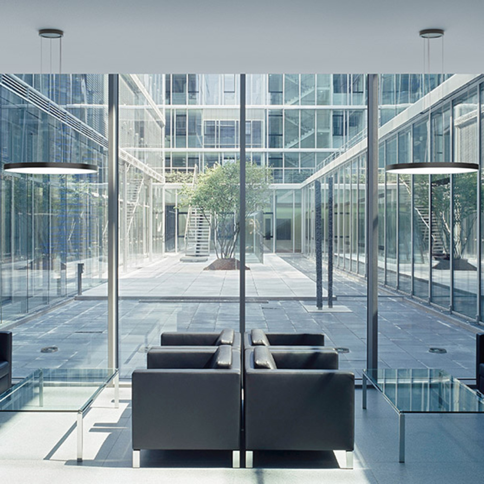 Verschiedene Diffusor-Ausführungen, darunter auch eine für Bildschirmarbeitsplätze geeignete, mikroprismatische Version mit UGR ≤ 19, erweitern TRIONA’s Einsatzmöglichkeiten zusätzlich. Die 680 Millimeter-Ausführung der Leuchte lässt sich alternativ sogar mit einer kunstvoll gefertigten FerroMurano-Glasscheibe veredeln und damit zum kostbaren Einzelstück machen.